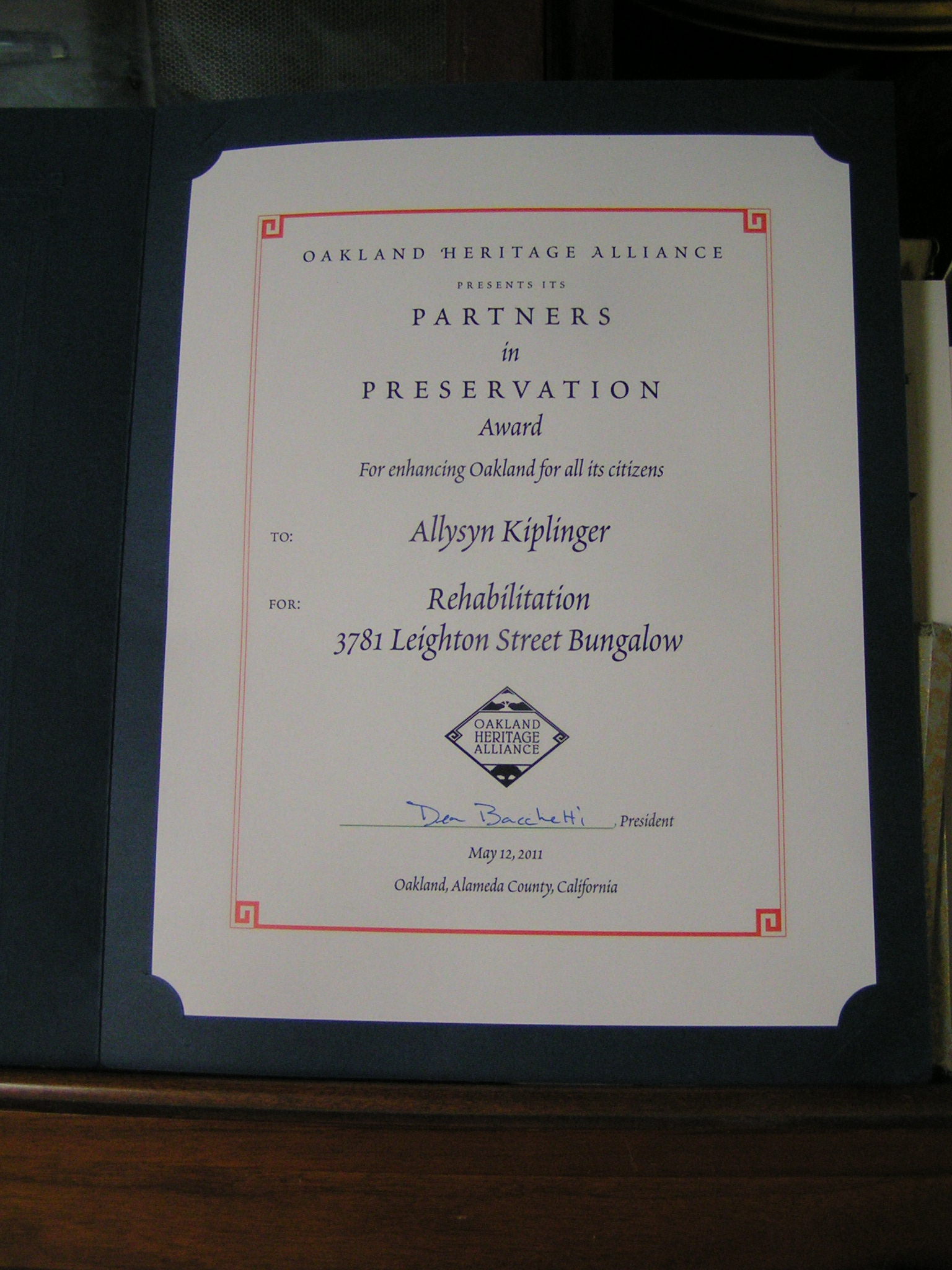 Nominated in March, we were informed on Friday, April 22, 2011, that we have won an award from the Oakland Heritage Alliance for our sensitive and tasteful historical renovation of 3781 Leighton Street, Oakland, CA.